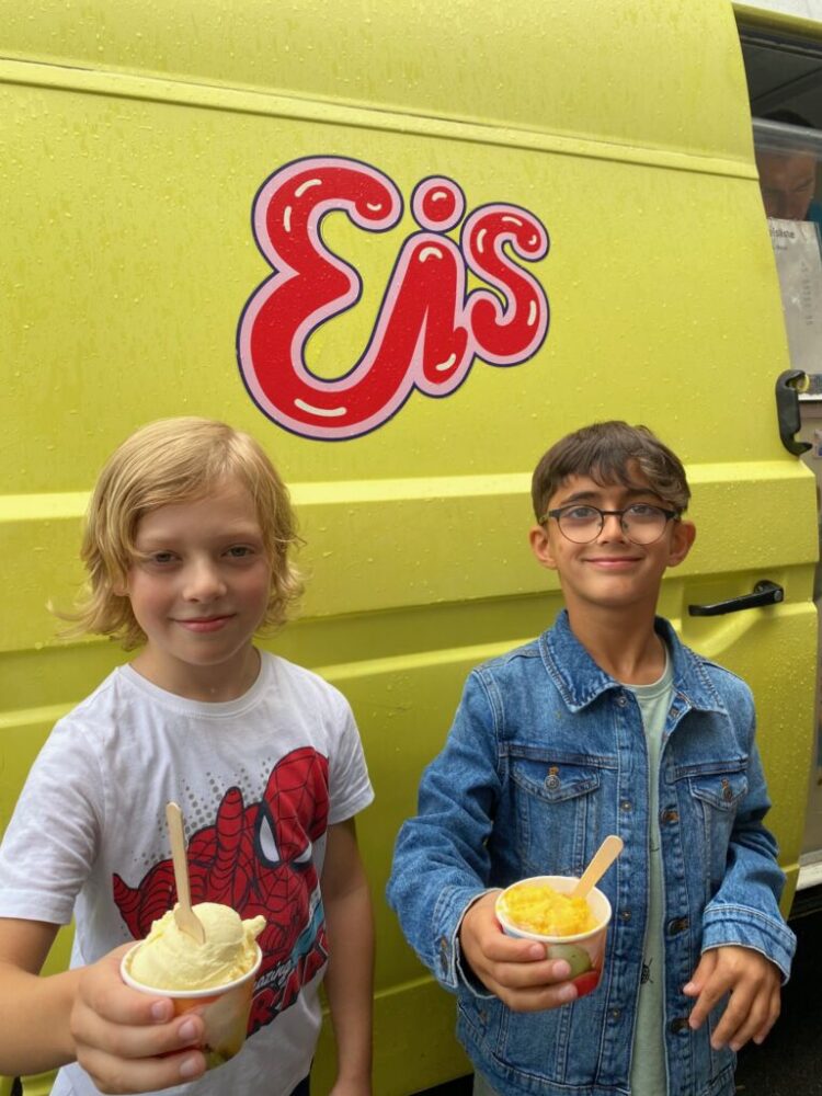 Denn der vom Förderverein der Grundschule organisierte Eiswagen fuhr mit großen „Hallo“ auf dem Schulhof vor. Der Förderverein der Grundschule spendierte jedem Schüler zum Abschluss des Schuljahres ein Eis! Gleich zwei Kugeln durfte sich jedes Kind und jeder Lehrer aussuchen. Und so hatten alle die Qual der Wahl. Vanille oder Zitrone? Erdbeere oder Cookie? Ganz egal, welche Kugel letztendlich in der Waffel landete, kurz vor Ferienbeginn kann einem nichts Besseres passieren. Ein riesengroßes Dankeschön an den Förderverein der Grundschule für die gelungene Eisüberraschung!